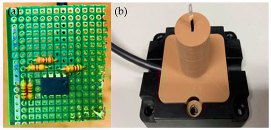 (a) External circuit board of the FS7.0.1L.195 wireless air velocity sensor; (b) photograph of self-developed packaging conforming to FS7.0.1L.195 dimensions.