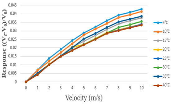 After the self-developed flexible micro air velocity sensor was completed, three home-built flexible micro air velocity sensors were soldered to a home-built circuit and connected to the signal transmission line of the Arduino development board. The data were read by the Arduino software, and testing and calibration were performed at different temperatures and air velocities of 1–10 m/s. Three readings are averaged in total. The original data was then normalized. The calibration is shown in Figure 7.