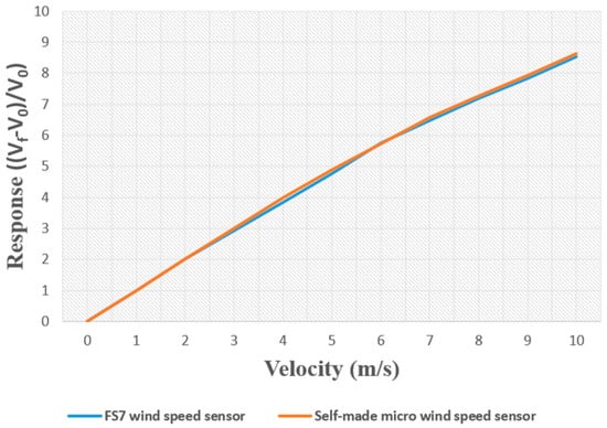 The FS7.0.1L 195 commercial air velocity sensor was calibrated at a temperature of 25 °C and air velocities of 1–10 m/s, and compared with the calibration of the home-built flexible micro air velocity sensor, as shown in Figure 8. The difference between them was very small, indicating consistency.