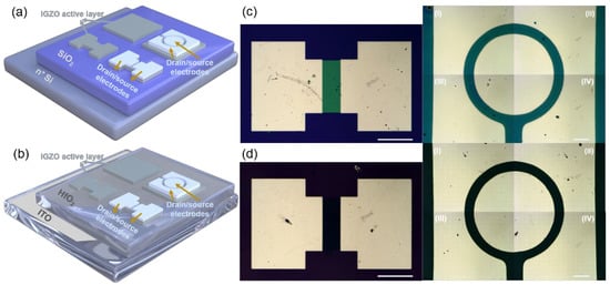 Schematic illustrations of fabrication of an IGZO/SiO2/Si thin-film transistor (TFT) (a) and an IGZO/HfO2/indium tin oxide (ITO) TFT (b). Microscope images of the rectangular and circular channel patterns of an IGZO/SiO2/Si TFT (c) and an IGZO/HfO2/ITO TFT. I, II, III, and Ⅳ are four parts of the circular channel pattern (d). The scale bar is 200 μm.
