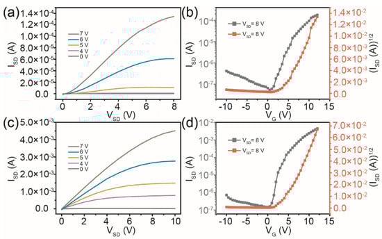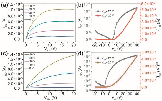 The IGZO channel layer was first deposited on Si/SiO2 substrates via a spin-coating process using the IGZO precursor solution. The prepared IGZO film was then annealed at 550 °C, lithographed, and covered with aluminium electrodes to obtain a TFT device with a rectangular channel pattern. The channel length and width of the IGZO/SiO2/Si TFT were about 100 μm and 300 μm, respectively. The pristine IGZO channel layer needed to be annealed to remove organic impurities and improve the film quality. The thickness of the prepared IGZO channel layer was about 40 ± 5 nm. The drain current (ISD) vs. drain-source voltage (VSD) output characteristics of TFTs with rectangular channel patterns at gate voltages (VG) from 0 to 40 V is shown in Figure 2a. The curves show the typical n-type TFT performance with the clear transition from linear to saturation behavior. The threshold voltage (VT) was estimated by extrapolating the linear portion of the (ISD)1/2 vs. VG curves at VSD = 20 V in the typical transfer curves of the TFT device with symmetrical rectangular electrodes. The TFT with rectangular pattern channel on a Si/SiO2 substrate exhibited an on/off ratio (Ion/Ioff) of 2.61 × 104 and a VT of 13.5 V. The value of field-effect mobility (μ) can reflect the carrier migration ability of a semiconductor under different electric fields [31]. The μ in the saturation region was evaluated from the following relationship: