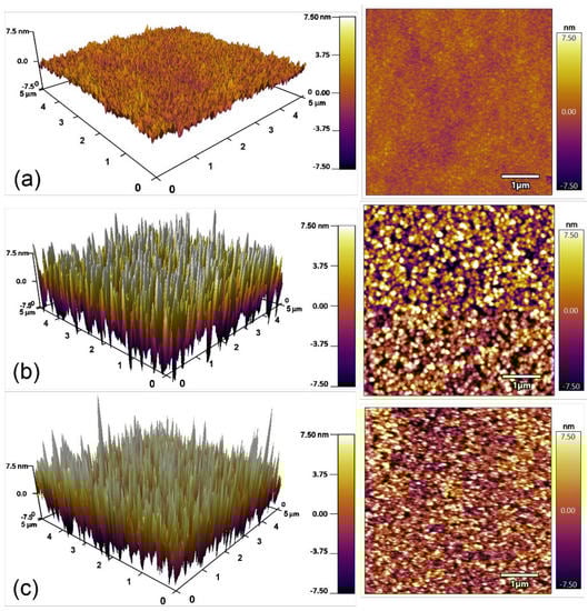 In the above, we discussed the variation of electrical performance of IGZO TFT devices on different substrates and with different patterns of drain/source electrodes. For the IGZO channel layer deposited by a spin-coating method, besides the advantage of a simple preparation process, the effect of the spin-coating on surface roughness of the channel layers should also be investigated. In Figure 4, the variation of the IGZO and HfO2 surface morphologies on different substrates was analyzed by atomic force microscope. As shown in Figure 4a, the IGZO channel layer by spin-coating on a Si/SiO2 substrate has a relatively flat surface with a roughness of 0.796 nm. The very low surface roughness benefited from the preparation of the channel layer from the precursor of the ionic solution. The HfO2 layer by magnetron sputtering on the ITO conductive glass has a rougher surface with a roughness of 4.460 nm, as shown in Figure 4b. However, the roughness of the HfO2 layer after coating the IGZO channel layer was reduced to 3.797 nm, as shown in Figure 4c. This is because the IGZO precursor solution can be effectively filled into the surface micro-porous structure of the HfO2 layer during spin-coating. Reducing the roughness of the surface helps decrease the scattering of carriers at the interface and further improves the transport capacity of carriers in the channel of TFT devices.