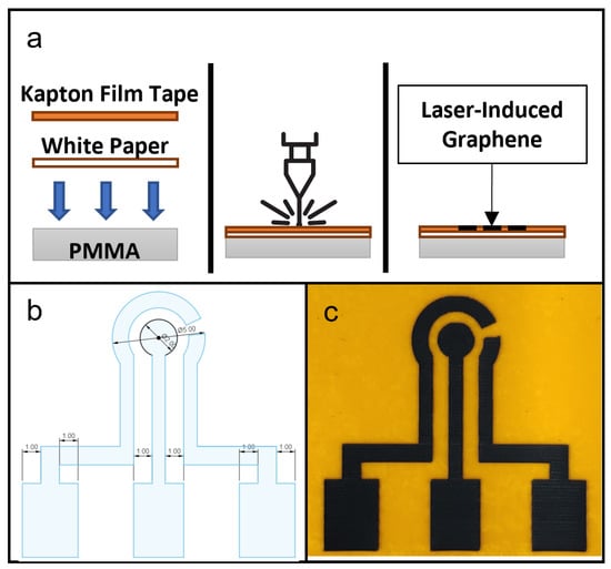A PMMA sheet, 1 mm thick, was used during fabrication by laser ablation as a flat mounting surface for flexible substrate layers adherent to Kapton film tape, to create an even, flat surface for consistent laser focusing and ablation. The polyimide material used in this study was 3M™ Polyimide Film Tape 5413 (Saint Paul, MN, USA), and the flexible substrate layer was a piece of white paper, cut to size. The PMMA sheet was placed at the bottom, with a piece of printing paper above it and the Kapton film tape used as the adhesive to both hold the paper onto the PMMA sheet and also provide the top surface material for laser-induced graphene production. The fabrication scheme is shown in Figure 1a.