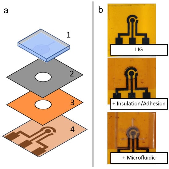 (a) Schematic depiction of assembly of a flexible microfluidic sensing device, showing the different layers of materials: (1) PDMS microfluidic chip, (2) adhesion layer and (3) insulation layer with circular cutout, and (4) LIG electrode unit. (b) Photographs of the assembly process, showing different layers being added on top of previous layers.