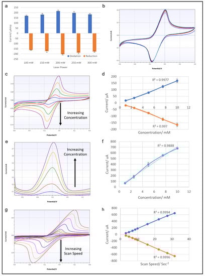 Another set of CV tests was conducted with a LIG electrode fabricated with a diode laser output of 200 mW. First, 10 mM potassium ferricyanide solution was used to run 10 consecutive cycles of CV. The results shown in Figure 4b proved that the LIG surface remained stable after repeated CV cycles, with no noticeable deterioration of the electrochemical performance. To test the concentration dependence of the response, potassium ferricyanide solutions with concentrations of 1–10 mM were tested in a series of CVs. The results in Figure 4c,d show CV traces for potassium ferricyanide solution of 1, 2.5, 5, 7.5 and 10 mM and the accompanying graphs of oxidation and reduction peaks. The CV traces showed both oxidation and reduction peaks expanding as the concentration of test analyte solution increased, as expected. The plotted data show R2 values over 0.99 for both oxidation and reduction current peaks, indicating a linear correlation with all concentrations of the samples. A similar concentration test was performed with differential pulse voltammetry (Figure 4e,f). However, the linear correlation of DPV oxidation peaks was not as strong as in the CV results, yielding an R2 value of around 0.988. The last CV test explored the effect of scan speed on LIG electrode. Figure 4g,h show the results of CV at scan speeds of 10, 25, 50, 75, 100, 250, 500, 750 and 1000 mV/s, with the corresponding data plotted on a graph. The CV traces clearly show increasing current response as the scan speed increased, and this relationship was highly linear, with an R2 value of over 0.99. Overall, this series of electrochemical tests prove the LIG electrodes to be stable and reliable conductive material, suitable for use in electrochemical sensing.