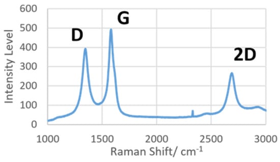The LIG was subjected to dispersive Raman spectroscopy to prove the presence of graphene on the surface. Focusing on the spectrum between 1000 and 3000 cm−1, there are three distinct peaks of interest, namely, D, G and 2D. Briefly, peak D (~1350 cm−1) indicates the level of defects in sp2-hybridized carbon structures, peak G (~1580 cm−1) shows the presence of graphene, and peak 2D (~2700 cm−1) was caused by second-order resonance, correlated to the number of graphene layers present [10]. The results from Raman spectroscopy are shown in Figure 5, with all three characteristic peaks of LIG present in the spectrum. A previous Raman spectroscopy study [30] had determined that the ratio of integrated intensities of peaks D and G (ID/IG) is inversely proportional to the size of crystalline nanographite in the materials. Referring to Figure 5, the intensity of peak G was clearly higher than that of peak D, indicating the formation of a crystalline graphitic layer on LIG. The result of Raman spectroscopy conclusively proved that the laser ablation protocol on polyimide material used in this study could effectively create graphene.