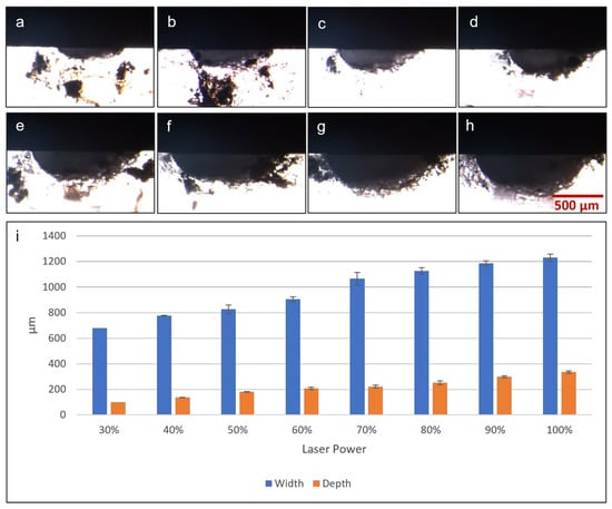 Microscopic photographs of microchannel cross-sections fabricated by diode laser with the following laser power: (a) 30%/480 mW, (b) 40%/640 mW, (c) 50%/800 mW, (d) 60%/960 mW, (e) 70%/1120 mW, (f) 80%/1280 mW, (g) 90%/1440 mW and (h) 100%/1600 mW. (i) Graph showing results of microchannel cross-section dimensions (width and depth) measured from microscopic photographs.