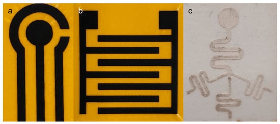 Photographs showing additional designs fabricated by the protocol presented. (a) LIG designed after commercial screen-printed electrode (SPE). (b) Interdigitated LIG electrode. (c) Microfluidic test design combining different elements, including straight and curved lines of different widths, intersection with branching multiple channels, and circular geometry in a single unit.