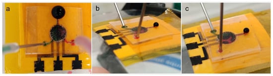 To assemble the flexible microfluidic sensing device, different components are arranged in layers in a specific order. From bottom to top, the layers are the laser-induced graphene electrode layer, insulation/adhesion layer and microfluidic layer. The insulation/adhesion layer consists of polyimide tape layer attached to 3M™ double-sided tape (Saint Paul, MN, USA) attached on top and laser-cut to create a circular opening for the electrochemical cell. During assembly, the three-electrode area of LIG, the circular opening in the insulation/adhesion layer and the circular chamber of the microfluidic chip are aligned by applying each layer manually with finger pressure. The assembly scheme is shown in Figure 3a.