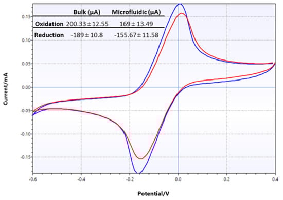 CV traces of LIG, comparing test results from bulk setting (blue) and microfluidic setting (red) performed with 10 mM potassium ferricyanide. The numerical data are shown in the inset table.