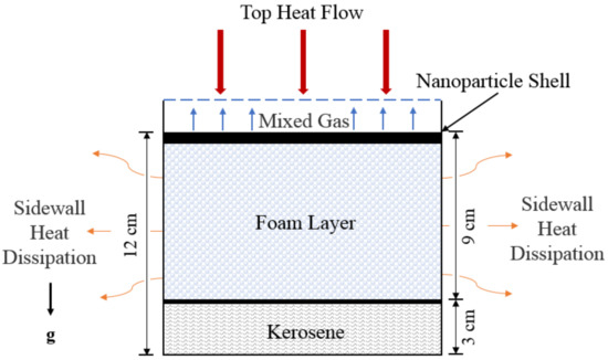 Under the thermal environment, vaporization of the liquid phase in the gel foam absorbs heat and strengthens the endothermic effect of the foam layer. The surface of the foam layer near the high temperature environment gradually fades with the breakage of bubbles in the foam [3,15]. In the thermal insulation tests of the foam layer, the testing points of temperature and heat flux can only be arranged in limited positions. Accordingly, the variation characteristics of temperature and heat flux with the heating time can only be observed in limited positions. Nevertheless, complete data of heat flux distribution during the heating process can be obtained through numerical simulation. Boyd [3] established a 1D static calculation model of the heat transfer in a gas–liquid two-phase foam layer in a thermal radiation environment, which considered the effect of evaporation and heat absorption of the liquid phase. The results showed that the energy balance in the foam layer was controlled by absorption and evaporation. Said [24] calculated the radiation heat transfer in nanofluids containing TiO2 nanoparticles (particle size less than 20 nm). Considering the absorption and scattering effect to thermal radiation by the particles, Said’s model showed that the thermal radiation attenuation coefficient was proportional to the particle concentration. Manetti et al. [25] developed a solid–liquid heat transfer porous foam model, and the results showed that the foam thermal conductivity was influenced by solid and liquid thermal conductivity, the latent heat of vaporization, and the saturation temperature of the liquid. A number of important factors should be taken into account when creating a heat transfer model of the foam layer containing particles due to the special microstructure and heat transfer characteristics in the foam.