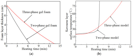 To demonstrate the thermal stability of the gel foams, the variation curves of the thickness of the three-phase gel foam layer and the surface temperature of the kerosene layer with the heating time at the typical operating condition were calculated (Figure 3). The temperature of the liquid phase in the gel foam increased as the liquid phase absorbed thermal radiation. Then, the liquid phase rapidly evaporated after reaching the vaporization temperature. Accordingly, the interface of the three-phase gel foam gradually dissipated with the heating time. Specifically, the gel foam layer gradually subsided. In Figure 3a, the extinction velocity of the thickness of the three-phase foam layer was slower than that of the two-phase foam, indicating that the particles in the three-phase foam are helpful in enhancing the thermal stability and thermal resistance of the foam. The heat flux penetrates into the gel foam layer to the lower kerosene layer, resulting in an increase in the temperature of the kerosene layer (Figure 3b). The temperature rising rate of the kerosene layer below the three-phase foam layer was lower than that of the kerosene layer under the two-phase foam layer, indicating that the thermal insulation of the three-phase foam layer was better than that of the two-phase foam layer. Furthermore, Figure 3b shows that the thermal resistance of the two-phase foam layer rapidly decreased after the heat flux penetrating into the two-phase gel foam reached the kerosene layer, resulting in a sharp rise in the temperature of the kerosene layer. Hence, the insulation performance of the two-phase foam layer failed.