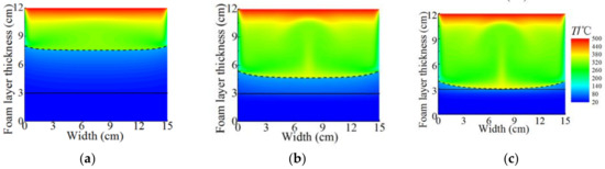 The temperature distribution is a visual reflection of the insulation performance of the gel foam. To investigate the thermal insulation properties of the gel foam, the temperature contour of the foam layer at three different heating times were extracted, as shown in Figure 4. The three different heating time points was 5 min, 10 min, and 13.31 min, respectively. As shown in Figure 4, the dashed line represents the upper surface of the gel foam layer, which is always curved due to the presence of heat dissipation from the side walls. The solid line represents the upper surface of the kerosene layer. The upper surface of the foam layer moved downward with the heating time due to the evaporation of the liquid phase and the fracture of bubbles in the gel foam layer. The heat flux and temperature decreased with the increase in depth inside the foam layer due to the intrinsic endothermic effect of the upper foam layer. At the interface between the foam layer and the kerosene layer, the temperature remained nearly stable, about 20 °C, during the whole heating process. As the heating continued, the temperature in the foam layer increased constantly, as shown in Figure 3b. At the heating time of 13.31 min (Figure 4c), little gel foam remained on the kerosene layer when the foam layer temperature reached the maximum value.