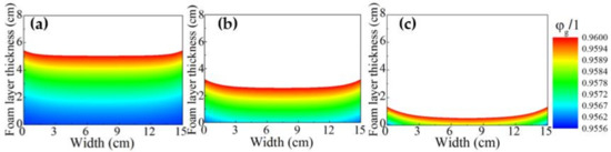 The volume fraction of the gas phase contributes significantly to the thermal stability and insulation performance. To show the variation in the gas phase volume fraction with heating time, Figure 5 presents the contour of the gas fraction in the foam layer at three different heating times. The heating times were 4 min, 8 min, and 12 min, respectively. The radiation heat flux enters the foam layer from the top of the foam layer, resulting in a relatively high temperature in the upper part of the foam layer and a relatively low temperature in the lower part. The expansion degree of the gas phase in the upper part of the foam layer was larger than that in the lower part; hence, the gas content in the upper part was higher than that in the lower part. In Figure 5a, the gas content in the foam layer was divided into three intervals from top to bottom at different depths, which were 0.9575–0.9600, 0.9525–0.9575, and 0.9500–0.9525. At the same thickness, the gas content in the foam layer near the side wall was relatively small. Meanwhile, the gas content in the central area was relatively large. This condition was attributed to the model that had sidewall heat dissipation. The foam temperature near the side wall was lower than that in the central area, and the degree of thermal expansion of the gas phase was relatively small. When heated for 12 min, the residual foam layer had a higher gas volume fraction because the liquid phase evaporated, and the foam layer almost disappeared. Figure 5c also indicates that a large amount of heat flow passed through the foam layer, and the temperature in the foam layer was relatively high, so the insulation of the foam layer will fail.