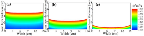 The thermal diffusivity of the conductive materials is the ratio of the thermal conductivity to the product of the density and specific heat capacity, which was employed to characterize the temperature homogenizing capability of the foam. To investigate the effect of heat time on the thermal diffusivity, the contour of the distribution of thermal diffusivity is shown in Figure 6. The heating times were 4 min, 8 min, and 12 min, respectively. As shown in Figure 6, the thermal diffusivity of the upper layer inside the foam was larger than that of the lower layer, showing obvious distribution inhomogeneity. The difference in the thermal diffusivity was caused by the inhomogeneity of the density distribution. Moreover, the thermal diffusivity also appeared to be inhomogeneous in the horizontal direction due to the presence of side wall heat dissipation. Similar to the distribution of the gas volume fraction as shown in Figure 5a, the distribution of thermal diffusivity in the foam layer could be roughly divided into two domains: the upper layer was in the range of m2 s−1, and the lower layer was in the range of m2 s−1, as shown Figure 6a. As the time increased, the temperature disturbance within the foam layer gradually transmitted downward, which was attributed to the continuous collapse of the foam layer.