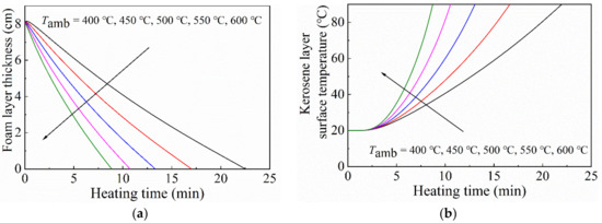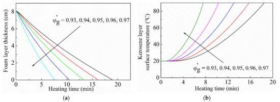As the thermal conductivity of the gas phase is much lower than that of the liquid phase, the gas content in the foam has an important influence on the heat transfer or thermal insulation of the gel foam layer. To demonstrate the thermal stability and insulation performance of the foam layers with various initial gas volume fractions, the foam layer thickness and kerosene layer surface temperature with the initial gas contents of 0.93, 0.94, 0.95, 0.96, and 0.97 were calculated and are shown in Figure 8a,b, respectively. The particle concentration was 1.0 vol%, and the particle diameter was 30 nm. The initial thickness of the foam layer was 8 cm. As the initial gas content of the foam layer increased, the decreasing rate of the foam layer thickness increased, so the durability of the foam layer was reduced. Accordingly, the temperature rise rate of the kerosene layer surface increased significantly. At room temperature, increasing the initial gas content of the foam could strengthen the stability and durability of the foam. However, at high temperature, increasing the initial gas content will weaken the thermal stability and heat insulation performance of the gel foam layer.