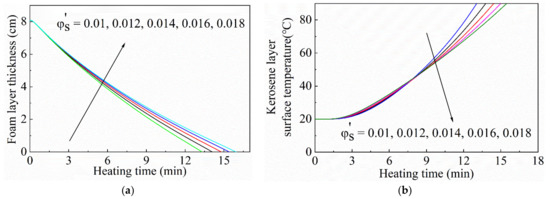 The silica nanoparticles in the gel foam could absorb and scatter the heat radiation. To investigate the effects of particle concentration on the thermal stability and insulation, the foam layer thickness and surface temperature of the kerosene layer were calculated. The particle concentrations were 1.0 vol%, 1.2 vol%, 1.4 vol%, 1.6 vol%, and 1.8 vol%, respectively. The particle size was 30 nm. The initial thickness of the foam layer was 8 cm. The initial gas phase volume fraction was 0.95. The durability and thermal insulation of the foam layer were characterized by the changes in the foam layer thickness and oil layer temperature, as shown in Figure 9. As the particle concentration of the foam layer increased, as presented in Figure 9a, the decreasing rate of the foam layer thickness decreased, so the durability of the foam layer increased. Accordingly, the temperature rise rate of the kerosene layer surface decreased. It was proven that the inside nanoparticles in foam play an important role in the stability and heat insulation performance of the foam layer. As shown in Figure 9b, in the initial stage of heating, the temperature rise rate of the kerosene layer surface decreased first with an increase in silica nanoparticles. After a period of heating, the temperature rise rate of the kerosene layer surface tended to slow down. This is because the addition of silica nanoparticles at the beginning of heating enhances the overall thermal diffusivity of the foam layer and strengthens the heat transfer performance of the foam layer. As the heating proceeds, there is a thin particle shell formed on the top surface of the foam layer with the foam collapsing in the heating progress, which is helpful to the thermal resistance of the foam layer.