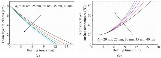 To investigate the effect of nanoparticle size on the durability and thermal insulation of the foam layer, the foam layer thickness and surface temperature of the kerosene layer are presented in Figure 10 as a function of heating time. The particle size was set at 20 nm, 25 nm, 30 nm, 35 nm, and 40 nm, respectively. The particle concentration was 1.0 vol%. The initial thickness of the foam layer was 8 cm. The initial gas phase volume fraction was 0.95. As the particle size in the foam increased, the decreasing rate of the foam layer thickness increased, so the durability of the foam layer decreased. Accordingly, the temperature rise rate of the kerosene layer surface increased. Increasing the size of the silica nanoparticles could weaken the absorbing and scattering effect of the particles on thermal radiation, so the thermal insulation performance of the foam layer decreased. Furthermore, small particles in the three-phase foam are favorable for the foaming efficiency and stability of the foam layer. Considering the foaming efficiency, stability, and heat insulation performance of the foam layer, small silica nanoparticles should be selected.