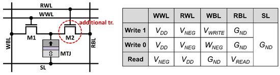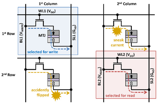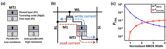 - Fong, X.; Kim, Y.; Choday, S.H.; Roy, K. Failure mitigation techniques for 1T-1MTJ spin-transfer torque MRAM bit-cells. IEEE Trans. Very Large Scale Integr. (VLSI) Syst. 2014, 22, 384–395. [Google Scholar] [CrossRef]