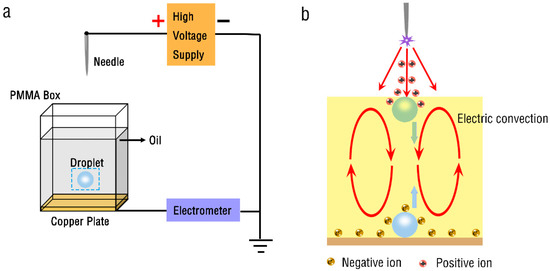 The mechanism of oscillatory motion of droplets in the presence of unipolar ion injection is rather complicated. A figurative explanation of the motion mechanism is shown in Figure 1b. The positive ions are generated because of the locally intense electric field of the needle tip. Positive ions are injected into the oil layer due to the action of the electric field and drive the oil layer to move, forming electric convection [28]. When the water droplet is put into the oil layer, it moves downward and contacts the grounding electrode. At this time, the water droplet is negatively charged and driven upward. On the contrary, when the water droplet moves upward to contact the air/oil interface, it carries positive ions and is driven downward.