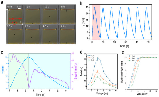 In addition, the experiment also found that the droplet’s movement period and maximum movement height would change with the discharge voltage, as shown in Figure 2d,e. The data of 2 μL, 4 μL, and 6 μL droplets, respectively, were tested in the experiment. The experiment found that the movement period of the droplet reached its maximum at about 8 kV. At this time, the maximum movement height of the droplet was also closest to the thickness of the oil layer. The larger the volume of the droplet under the same voltage, the smaller the movement period and the lower the movement height.