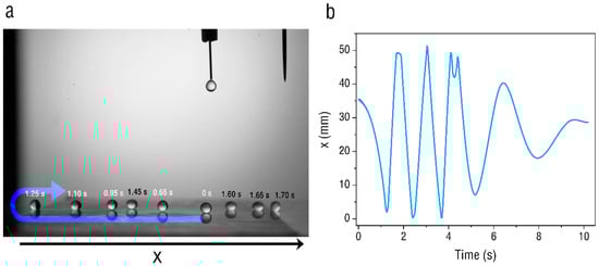 Figure 5 presents the droplet dynamics on the hydrophobic surface at the applied voltage of 8 kV. The water droplet drops from the dropper to the PET film surface through the peristaltic pump, and the height of the dropper is level with the tip of the needle. The time when the droplet starts to contact the PET film is recorded as 0 s. Figure 5a shows a sequence of images of a single droplet between the two sides of the PET film. When the droplet starts to contact the PET film, it is positively charged and moves to the left, as it is driven by the electric field on the film surface. Then, the droplet contacts the PET film boundary and starts to rebound, moving to the other side of the PET film. Moreover, the droplet does not move strictly along the x-axis direction due to the uneven distribution of the film’s electric field. Figure 5b shows the droplet position along the x axis as a function of time. It can be seen in the figure that the droplet can contact both sides of the PET film at the beginning and rebound in the opposite direction. With the weakening of the rebound speed of the droplet, the movement of the droplet gradually slows down and finally stops in the center of the PET film.