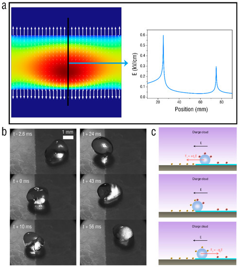 (a) Electric field simulation of PET film at voltage of 8 kV. (b) Electrohydrodynamic behavior of water droplet at PET-film boundary. (c) Mechanism for droplet rebound.