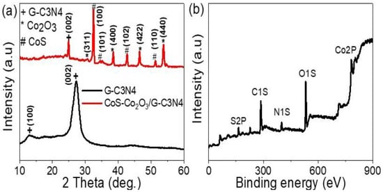 (a) XRD of G-C3N4 and CoS-Co2O3/G-C3N4 composite and (b) XPS of CoS-Co2O3/G-C3N4 composite.