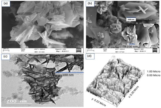 The morphological and structural analysis of the samples were based on the correlation of SEM, TEM, and theoretical modeling images. Figure 2 represents SEM images of the (a) G-C3N4 and (b) CoS-Co2O3/G-C3N4 composites. The G-C3N4 has 2D nanosheet properties; the formed sheets enfold and crumple in some areas. The 2D nanosheets have an average width and length of 80 nm and 170 nm. It can be seen that both images reveal a thin sheet structure. Indeed, this was clearly distinguished through the TEM image (Figure 2c) of the G-C3N4, illustrating flat irregular shaped sheets with wrinkles. The dark area covering the sheets confirms CoS-Co2O3 incorporation in G-C3N4 sheets.