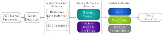 Weld depth measurements are performed by OCT data and the metallographic evaluation of probes. Scanned OCT measurements follow the same data processing procedure: OCT sensor signal transformation to depth information, noise reduction, segmentation in y-direction, segmentation in z-direction, and feature extraction for the measurement of weld penetration depth (Figure 2). The OCT sensor signal transformation to depth information is carried out by the k-linearization of the sensing data and Fourier transformation of the measurement information.