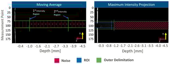 Only the keyhole opening is considered for further processing steps. The segmentation of the keyhole opening in the z-direction aims for the isolation of measurement information from the keyhole bottom by separating the workpiece surface, the keyhole region, and the region below the keyhole. Two different methods are applied for this segmentation process: the moving average method [] and the maximum intensity projection (MIP) method [] (Figure 3).