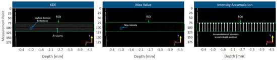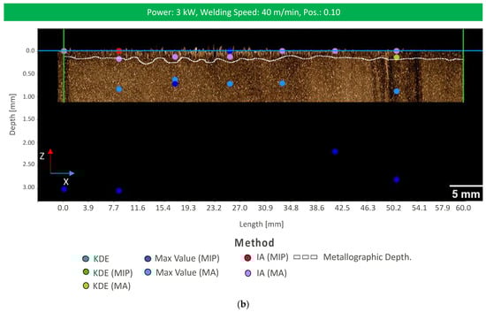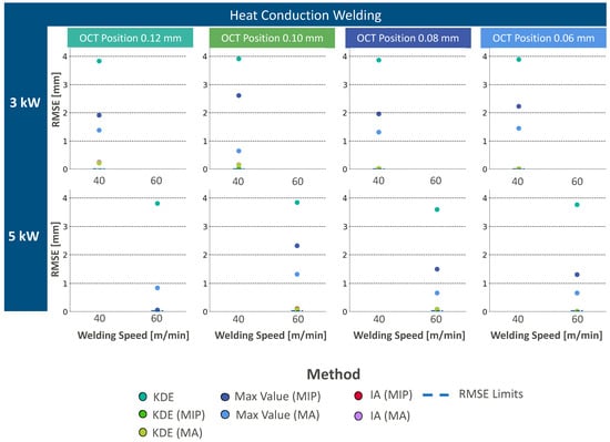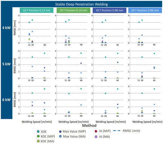 OCT measurement information in the case of stable deep penetration welding processes shows characteristically increased noise in the keyhole region, due to the influence of the vapor plume and the high reflectivity of the molten material, with a maximum signal intensity within the ROI at the keyhole bottom (Figure 5a). We applied different combinations of z-direction segmentation approaches and weld depth extraction methods (Figure 5b). Data processing results can be found in Figure 5b and Figure 6 for KDE (green), max intensity (blue), and IA (red) for all four different OCT measurement positions and different segmentation methods. The RMSE limit results from the difference between the maximum and minimum metallographic weld seam depth of the corresponding welding parameters. Measurement results below this limit can be considered good weld depth measurements. Measurement results above this limit can be considered as not successful weld depth measurements.