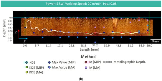 The application of segmentation methods, such as MIP and MA, improves the accuracy of the weld depth extraction method and tends to the identification of underestimated weld depths (Figure 8). The underestimation leads to the conclusion that the measurement beam cannot be directed on the keyhole bottom, and is rather positioned on a bulge of molten material. Interestingly, the RMSE values for KDE-based weld depth extraction tend to be lower than RMSE values with weld depth extraction by intensity accumulation. This is the case as the intensity accumulation approach sums up the values in lateral direction and evokes higher RMSE values as the measurement information rather contains information from the dynamic molten material surface at different depth positions. In consequence, the weld depth is rather underestimated.