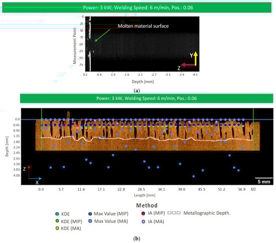 (a) OCT image of the weld depth measurement for unstable deep penetration welding; (b) resulting weld depth measurement for each data processing method with a longitudinal cross-section of the unstable deep penetration weld.