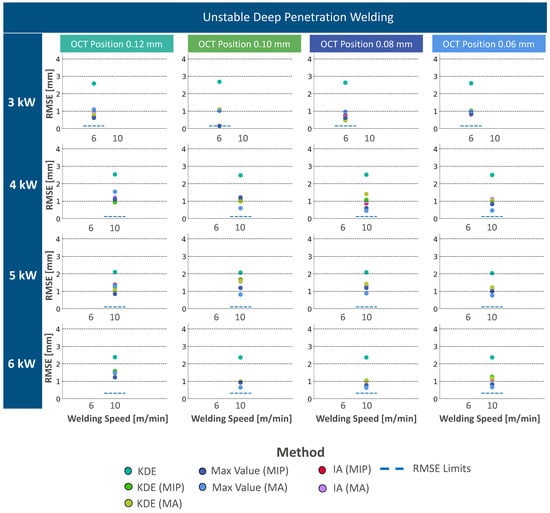Resulting RMSE values for different applied laser and OCT parameters as well as different data processing approaches in the case of unstable deep penetration welding.