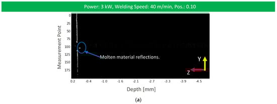 Parameters are varied for laser process parameters, and OCT parameters (Table 1). The laser process parameters are varied by process regime in the case of heat conduction welding, stable deep penetration welding, and unstable deep penetration welding with the formation of melt ejections. The process regime under investigation depends on the combination of laser power and welding speed and varies between 3000 W and 6000 W as well as 6 m/min and 60 m/min. The OCT parameters are varied in terms of the measurement position in the x-direction relative to the tool center point. The relative OCT position is chosen to be trailing due to the expected tilt of the keyhole wall. The measurement position is varied from 0.06 mm up to 0.12 mm in 0.02 mm steps as keyhole mapping in literature resulted in optimal positioning for this step size []. All parameters in Table 1 are repeated three times for each set of parameters.