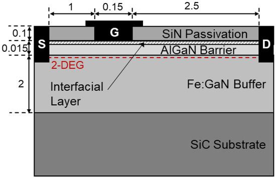 The devices under study (DUTs) were AlGaN/GaN HEMTs grown on SiC substrates. The AlGaN barrier layer is 15 nm thick with a 22% aluminum concentration. Iron (Fe) impurities are introduced in the 2 μm-thick GaN buffer to reduce drain-source leakage and increase breakdown voltage. Iron concentration in the GaN buffer starting from the SiC substrate interface was constant at 1 × 1018 cm−3 until 0.6 μm below the AlGaN/GaN interface, above which it decayed with a slope of one decade every 0.4 μm. The devices were passivated by a 100 nm-thick SiN layer. Gate length (LG) was 0.15 μm and gate width (WG) was 2 × 25 μm. Threshold voltage (VTH) was −2.2 V. The cross-section of the DUTs is shown in Figure 1.