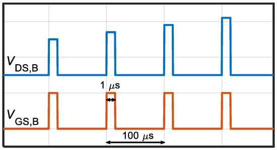 Pulsed I-V measurements were carried out by applying synchronous voltage pulses to the gate and drain terminals from a reference baseline while keeping the source contact grounded. Voltage pulses were 1 μs long with duty cycle of 1%. An illustration of the signal waveforms used for the pulsed I-V curves acquisition is shown in Figure 2