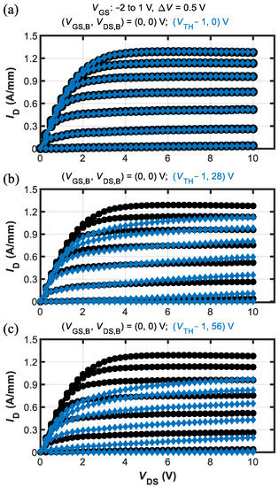 Results of this kind of characterization are shown in Figure 3 in terms of output ID-VDS curves. The output characteristics were acquired from four different baselines, namely: (VGS,B,VDS,B) = (0, 0), (VTH–1, 0), (VTH–1, 28), and (VTH–1, 56) V. Figure 3a shows the comparison between the (0,0) and (VTH–1, 0) baselines, allowing us to assess the gate-lag effect. Interestingly, in these devices no appreciable gate-lag was detected, indicating excellent stability of the device region under the gate. Figure 3b,c show the comparison between the (0,0) baseline and the (VTH–1, 28) and (VTH–1, 56), respectively. Both figures showed moderate increase of knee voltage but significant saturated current compression, especially for ID-VDS curves at high VGS. These results indicate that trapping effects leading to current collapse were most likely happening in the gate-drain access region [2]. As such, the amount of degradation as well as its dependence on the applied VDS were influenced by the gate-to-drain spacing.