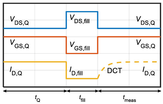Illustration of signal waveforms employed during the DCT characterization. A short (1 μs) or long (100 s) trap-filling pulse was applied by driving the device in the OFF-state. Then, DUT was biased back at (VGS,Q, VDS,Q) and ID was measured over several time decades up to 100 s to acquire the actual DCT. Waveform values and time intervals are not in scale.