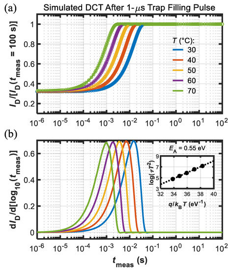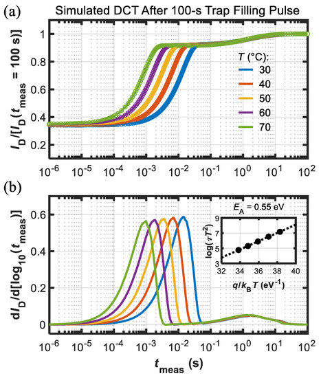 (a) Simulated DCTs at different temperature (see legend) after the short 1 us trap-filling pulse (dots are data and lines are fitting functions). Current was normalized to final value, i.e., ID(tmeas = 100 s). (b) dID/d[log10(tmeas)] used for the extraction of the time constants (τ) to build the Arrhenius plot (see inset) that yielded EA = 0.55 eV.