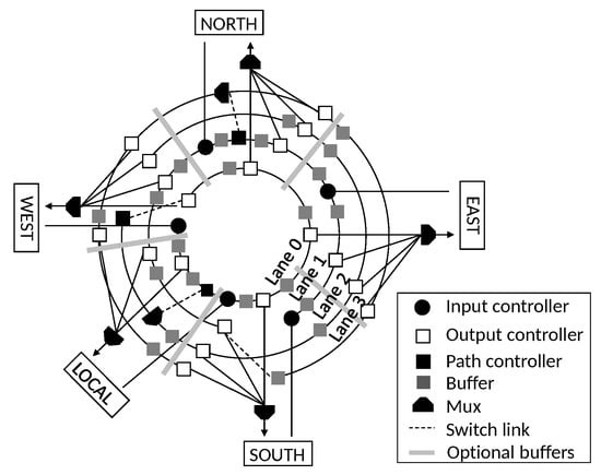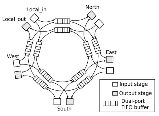 The Roundabout-NoC (R-NoC) concept, dedicated to mesh network topologies [,] was proposed with high buffering resources utilization as the primary design objective. R-NoC is inspired by real-life traffic roundabouts and consists of lanes, across which buffers are distributed, and shared by multiple input/output ports for efficient traffic management. Owing to its inspiration from real-life traffic roundabouts, internal routing and arbitration are distributed and adaptive. It shares similar ring-like/traffic-roundabout features to the popular Rotary router []. However, as it is extremely challenging to use wormhole flow-control in ring-like router architectures (or folded network topologies like Torus), the Rotary router [] uses combined virtual-cut-through (VCT) and bubble flow-controls, known as local bubble scheme, to circumvent deadlocks occurrence. Unfortunately, VCT requires large buffers, which introduce overheads in terms of area and power and therefore impede applicability for on-chip communication networks.