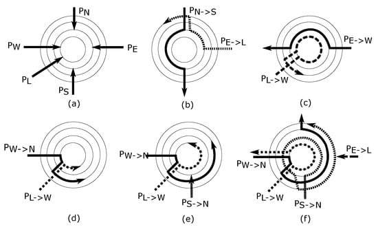 An incoming packet travels along the ring to its destined output port and exits the router if the output is available. Conversely, the packets continue along the ring until an alternative suitable port is determined, as shown through Figure 2d–f.