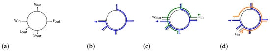 Assuming that the west input port is selected from the set of inputs port in line 2 of Algorithm 1 and associated to a selected lane l in line 3, then the resulting configuration is shown in Figure 4a, where the west input port and its valid output ports are connected to the lane. Upon executing line 4 of the algorithm, the resulting configuration is shown in Figure 4b with “blue label” indicating valid output ports for a packet flowing from the west input port as displayed in Table 1. No cyclic dependency exists in Figure 4b as the path between north output port to west input port is not labelled.