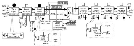 For cases (1), (3), and (5) the path labeled “out port” is selected and the flit is forwarded to the output port. However, the flit is forwarded to the lane for case (3) if the output port controller is located on lane 1 (see Figure 7). For cases (2) and (4), the path labeled “Lane” is selected and the flit is forwarded to the lane. The reserved path is kept active for the other flits transmission. The path controller is similar to the output controller in terms of functionality. It forwards a packet to the lane if the packet path is not blocked on the primary lane. Otherwise, it switches the packet to a secondary lane. In Figure 7, the job of the path controller on lane 2-west is only to request the next router resource.