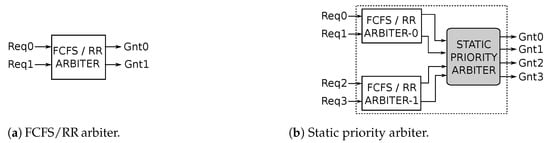 First-Come-First-Serve (FCFS)/Round-Robin (RR) and static-priority arbiter (a,b).