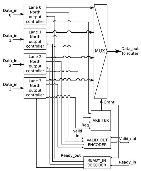 - Tran, A.T.; Baas, B.M. DLABS: A dual-lane buffer-sharing router architecture for networks on chip. In Proceedings of the 2010 IEEE Workshop On Signal Processing Systems, San Francisco, CA, USA, 6–8 October 2010; IEEE: Piscataway, NJ, USA, 2010; pp. 327–332. [Google Scholar]