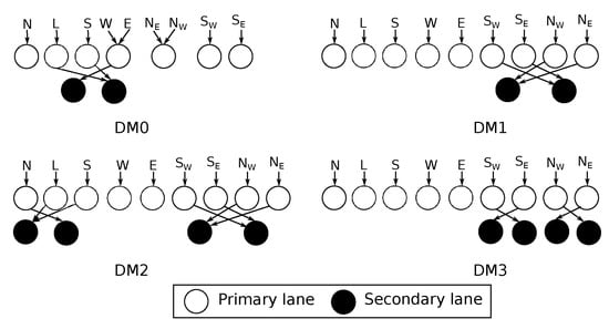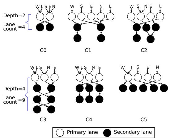 Sharing all of the lanes between each and every input port allows the router buffering resources to be adequately utilized, which significantly improves network throughput. Nevertheless, allowing packets from all input ports to use all of the lane resources can lead to deadlocks on the lanes. This is due to cyclic dependencies that arise when packets are simultaneously occupying some lane resources and requesting lane resources occupied by other packets []. An example of such a situation is depicted in Figure 3f.