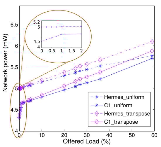 In an attempt to mitigate area and power overheads associated with conventional NoCs, several recent works focused on drastically simplifying or conversely better using NoC resources. Router-less NoCs [,,] have recently been proposed, based on eliminating routers (i.e., the routing function) and relying on design-time decided physical routes serving all IP the system is made of. This can further be combined with rather dense physical interconnects [] that exploit advanced wiring capabilities of contemporary processes. Buffer-less [] routers completely remove buffers inside routers. This reduces on-chip area overhead and saves a considerable amount of the total router power dissipation. In buffer-less routing, packets that are unable to progress to their desired destination ports are deflected or misrouted since there are no buffers in the router to store packets. Packets are continuously deflected from hop to hop until they finally reach their desired destination nodes. Intuitively, only a few packets are deflected at light traffic injection rates due to low network contentions. However, it has been observed that buffer-less routers consume significantly more dynamic power and have higher packet latency compared to buffered routers [,]. This is because more and more packets get deflected further away from their destination nodes at high traffic injection rates and the deflected packets unnecessarily consume the router link bandwidth. Buffer-less design style may therefore be a good fit for moderate-bandwidth (and low-latency) application domains with tight power constraints, but do not provide a satisfactory solution for traffic-intensive use cases.