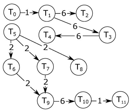 Figure 17 shows a sample application task graph. In the graph shown in Figure 17, the nodes represent tasks, while the edges represent communications. As an example, a bandwidth of 6 Mbps is required for the communication between task and task . The method for generating the experimental traffic for these applications relies on [].